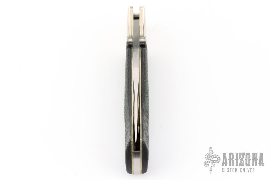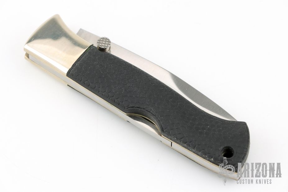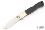This Mamba Lockback from Blackjack Knives features a satin finished recurve blade with dual checkered thumbstuds. The handle has nickel silver bolsters, and nickel silver liners. The handle has rubber scales and a stainless rockerbar. Has a couple light scratches, otherwise excellent condition.