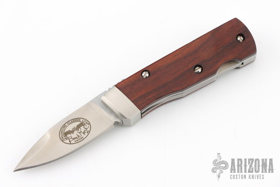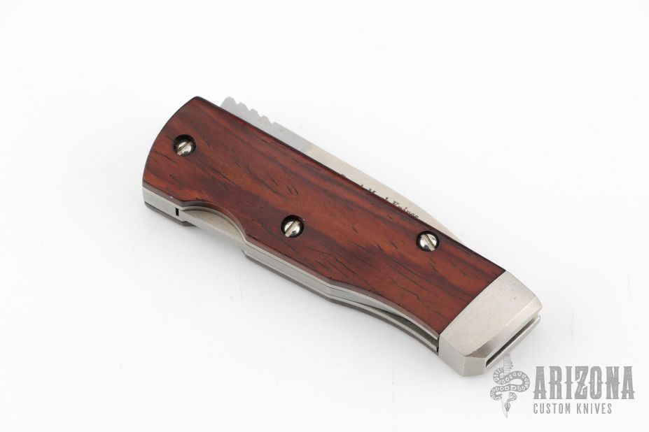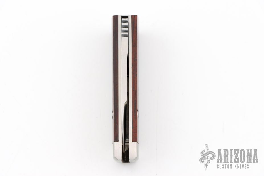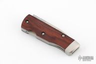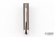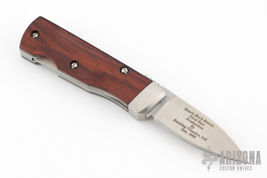 This Benchmark Rolox is a very rare slide back "folder". With .125" blade thickness and .646" blade depth. The design is simple yet effective. Feature stainless steel bolsters, liners and lockbar with beatiful cocobolo scales that contour nicely to your hand. You push down on the back of the thumb notches of the blade to release and slide it forward into position. Very neat design. Comes with a zippered case. Excellent condition.
