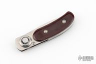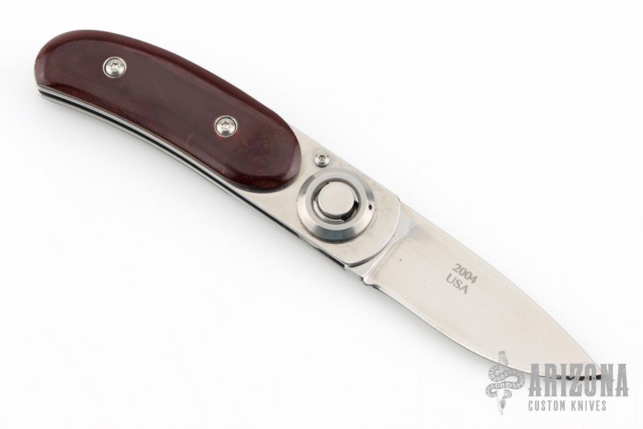 This Paul Pocket Knife features the Paul Poehlmann axial locking mechanism. Opens by depressing the button on the backside and rotating the face side dial. Closes the same way, rotating the dial in the opposite direction. The handle is comprised of brown linen micarta scales over stainless steel liners and backspacer. Excellent condition. Comes with a zippered case. Dated 2004