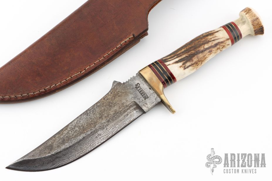 This hunter by Marble's features a Damascus blade with notched thumbrest, .184" blade stock and 1.751" blade depth, hidden tang construction. The handle has a brass guard, stag grip and butt with wood and brass spacers. Comes with original brown leather sheath. Has some scratches and oxidation, otherwise good user condition.