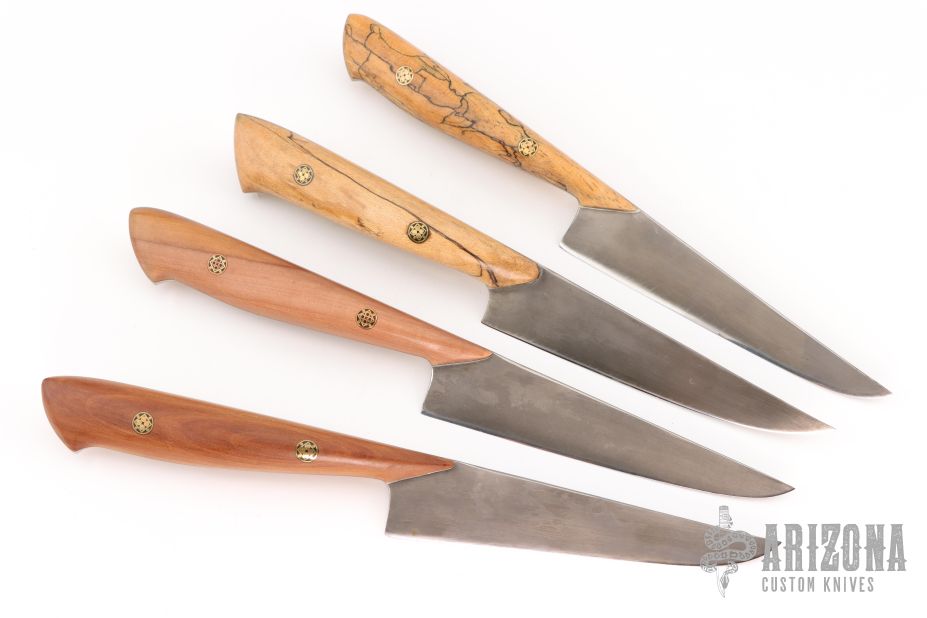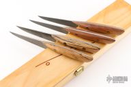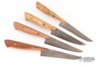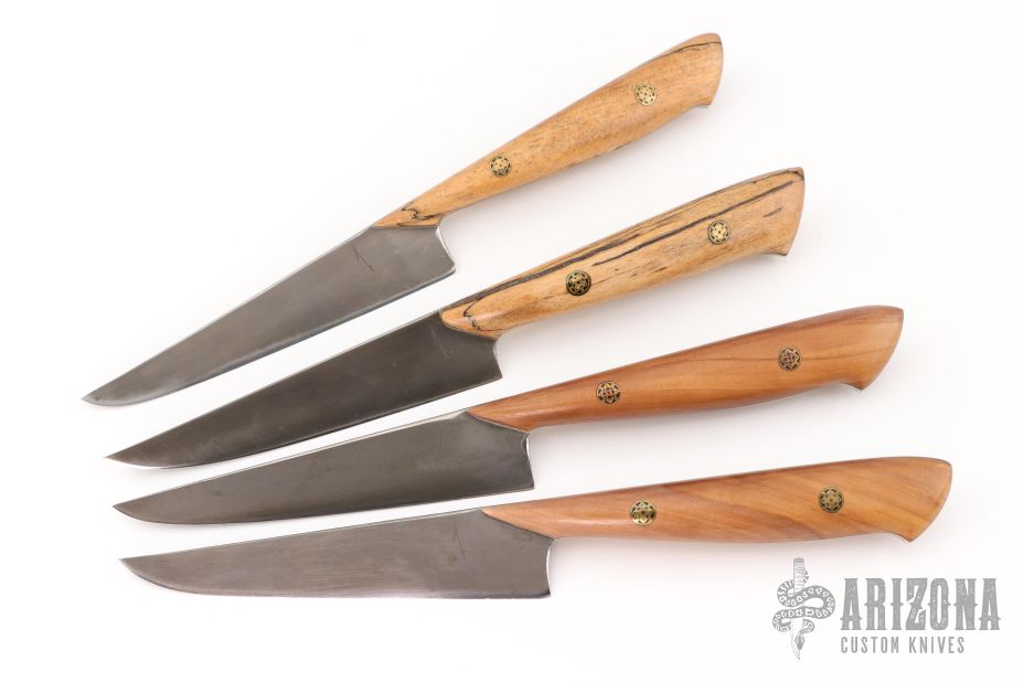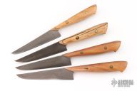 This set of 4 steak knives from Moriah Cowles of Orchard Steel feature lightly blued and hand rub satin finished blades with .090" blade stock and .989" blade depth, full tang construction with wood scales and mosaic pins. They have been lightly used, have some light scratches and patina, otherwise good condition.