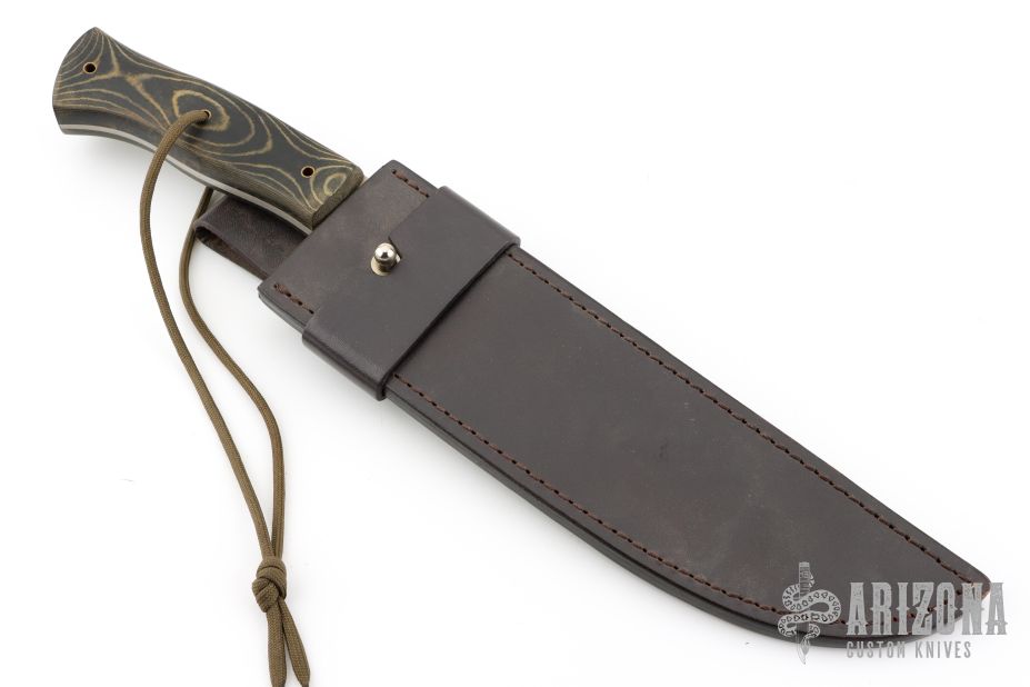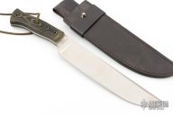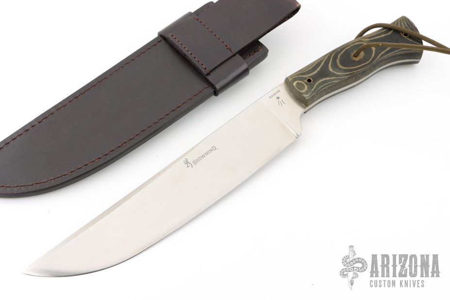 This Crowell/Barker Competition Knife by Browning features a satin finished blade, .229" blade stock and 1.839" blade depth, full tapered tang construction with black linen micarta scales. Comes with original black leather sheath. Excellent condition.