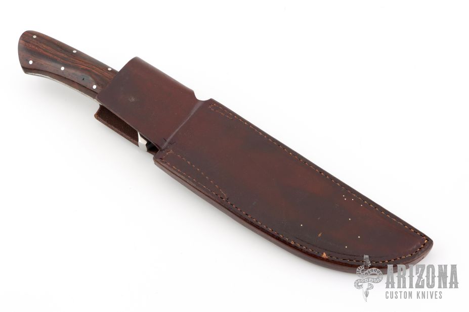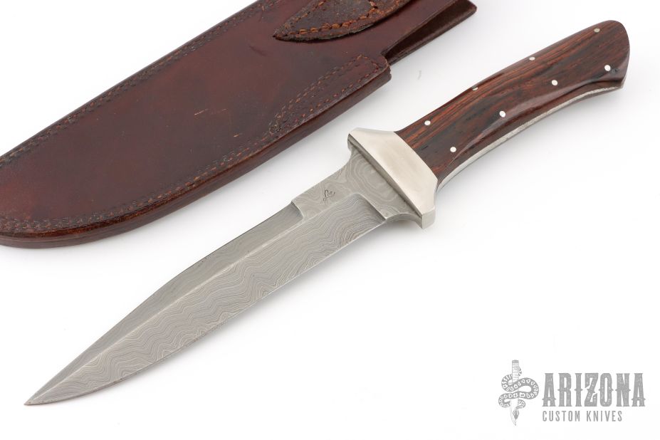 This Fighter by Jim Lee features a Damascus clip point blade with top edge, .179" blade stock and 1.283" blade depth, full tapered tang construction. The handle has stainless steel dovetailed bolsters/guard and ironwood scales. Comes with a brown leather sheath. Has some scratches and rusting. Good condition otherwise.