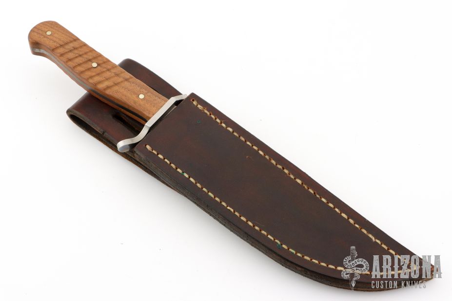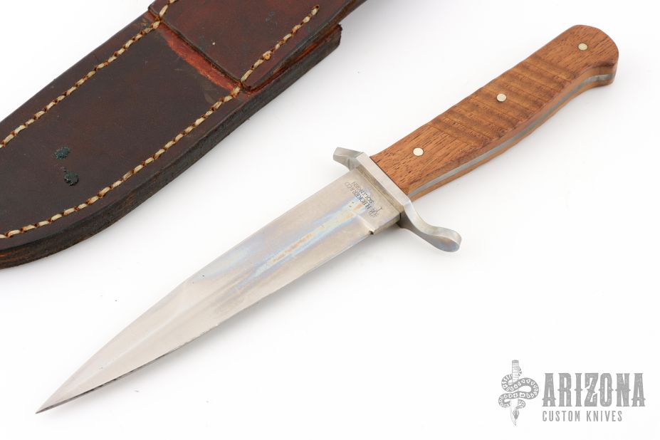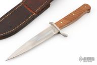 This knife features a satin finish spear point blade with .140" blade stock, 1.028" blade depth, and full tang construction. The handle has a steel guard, with wood covers and lanyard hole in pommel. Comes with a leather sheath. Has scratches and some rust, good condition otherwise.