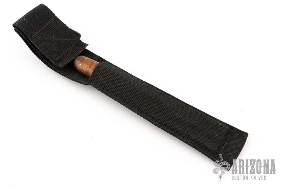 This knife by Dave Palmer features a forced patina/acid etched notched thumbrest, .061" blade thickness and 1.14" blade depth, full tang construction. The handle has pinned wood scales. Comes in a nylon sheath. Has some light scuffs, excellent condition otherwise.