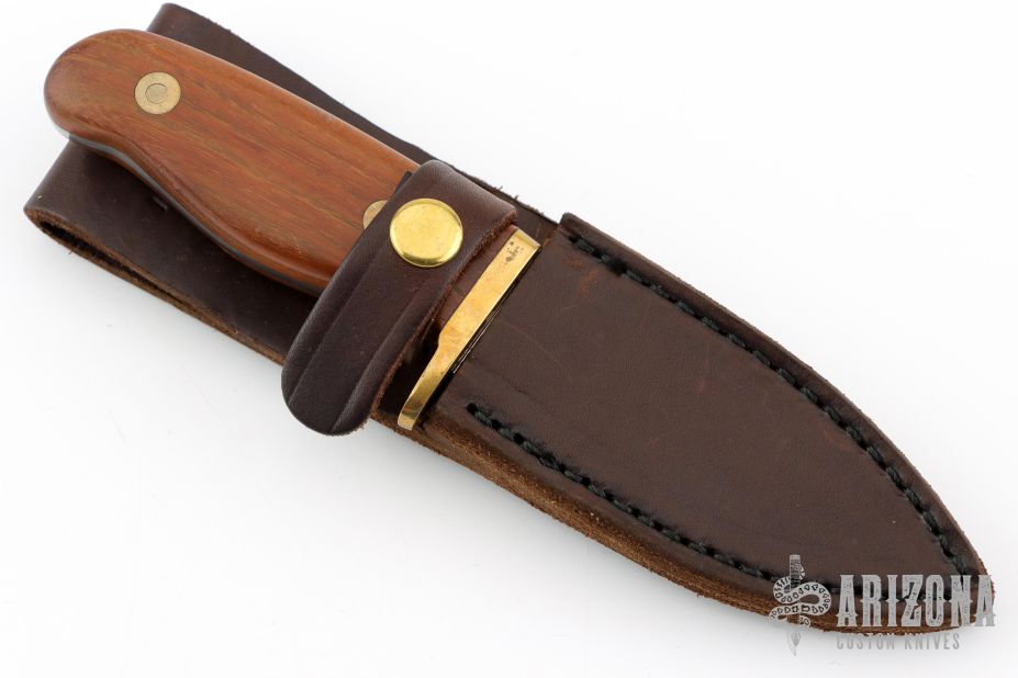 This knife by D Anscomb features a mirror polished blade with .125" blade stock and 1.091" blade depth, full tang construction. The handle has a brass guard, wood scales with brass pins. Comes with a brown leather sheath. Has a light stain on the blade, otherwise good condition.