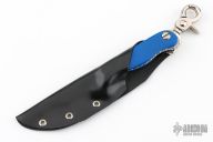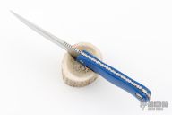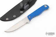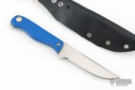 This Bird and Trout by Markley Lahrmann features a satin finished blade with notched thumbrest, .126" blade stock and .749" blade depth, full tang construction. The handle has blue G-10 scales and a fileworked tang. Comes with a Kydex sheath with dangler hook. Has some light scratches, otherwise excellent condition.