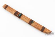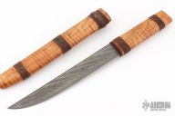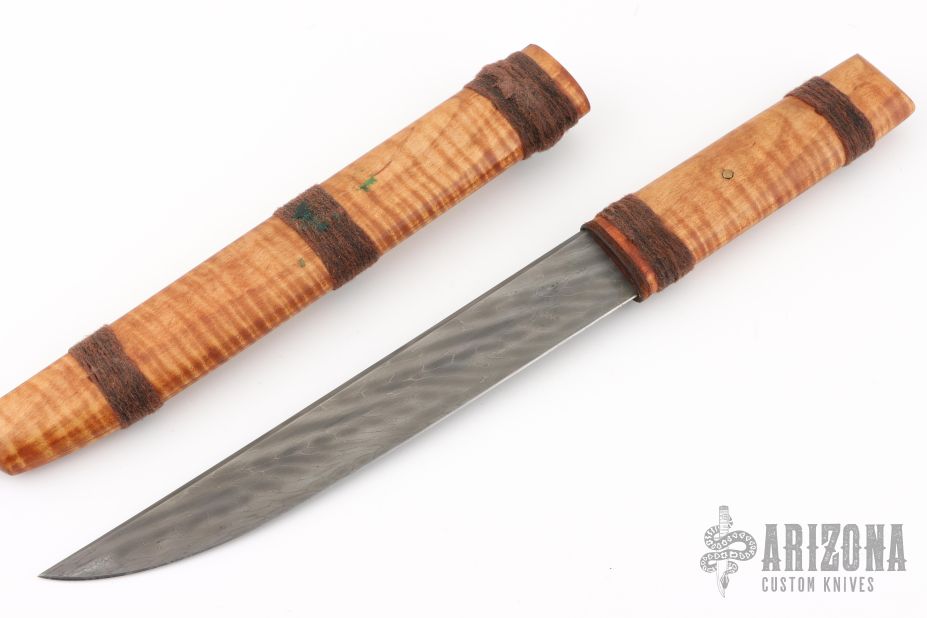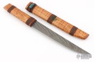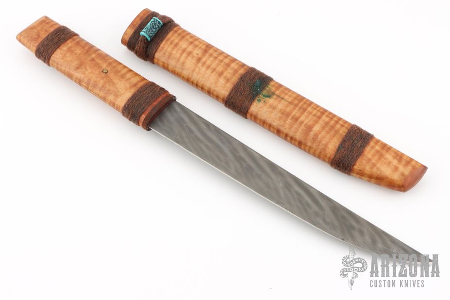 This Tando by John Greco features a Damascus blade with .225" blade stock and 1.268" blade depth, hidden tang construction. The handle has a leather habaki, cord wrap, and a two-piece bookmatched curly maple grip with single pin. Comes a matching saya. Blade is marked on the tang under the handle. Has some patina and light rusting. Great condition otherwise.
