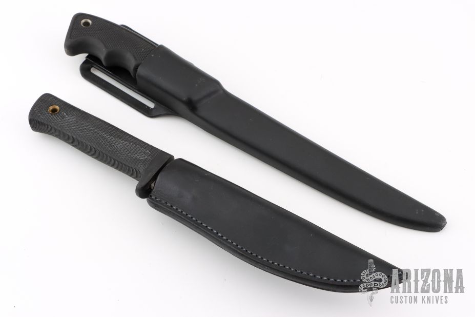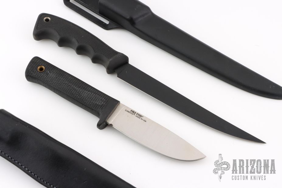This Cold Steel Fillet knife features a black trailing point blade, with .102" blade stock, .935" blade depth, 7.5" blade length, 12.5" overall length, weighs 4.8oz, has rubber grip with finger grooves and lanyard hole. Comes with original plastic sheath. Has some wear, great condition otherwise. Blade steel is not marked on the blade.