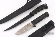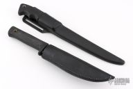 The spine of the blade is a full 3/16" thick to allow for the necessary strength and stiffness to field dress and skin the biggest animals like elk, moose, brown bear, and the African Dangerous Seven. The grip is specially designed to promote long use without fatigue. Made of the shock absorbent, slightly tacky feeling Kraton, and featuring our deeply checkered surface, it positively won't slip no matter how wet or bloody your hands get. Plus, Kraton has specially enduring advantages in that it will never rot, shrink, crack, splinter, or mildew, and is completely impervious to even the harshest weather.