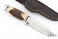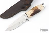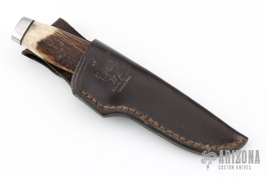This Hunter by Hen & Rooster Knives features a satin finished blade with .139" blade stock and 1.227" blade depth, hidden tang construction. The handle has a stainless steel guard and butt with a stag grip. Comes with original brown leather sheath. Has some scratches, otherwise good condition.