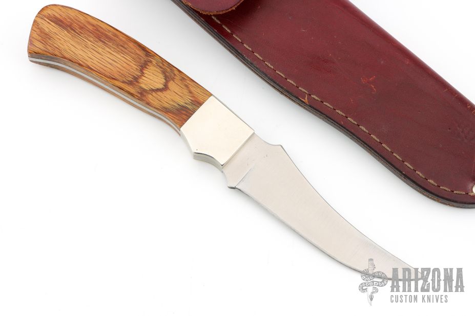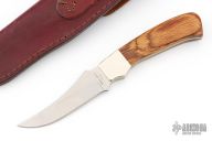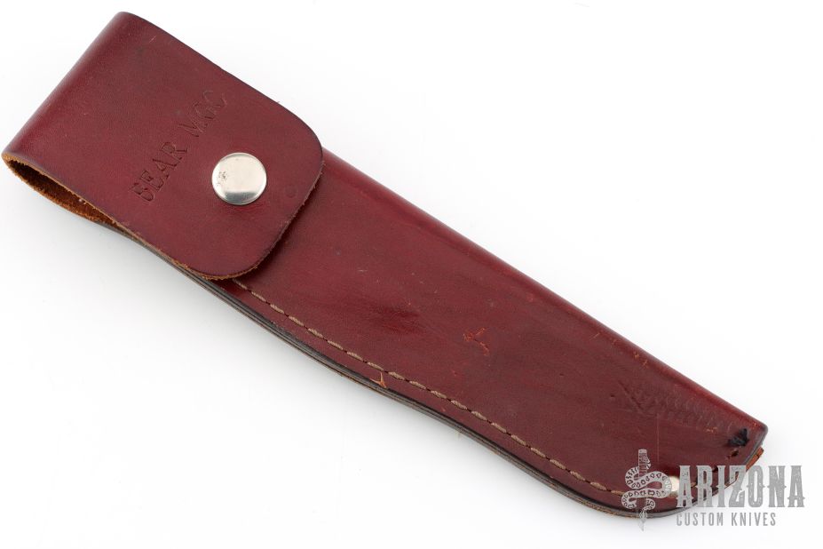 This Hunter from Bear MGC Cutlery features satin finish blade with .106" blade stock and 1.178" blade depth, full tang construction. The handle has nickel silver bolsters and wood scales. Includes a brown leather sheath with belt loop. Has scratches, otherwise good condition.