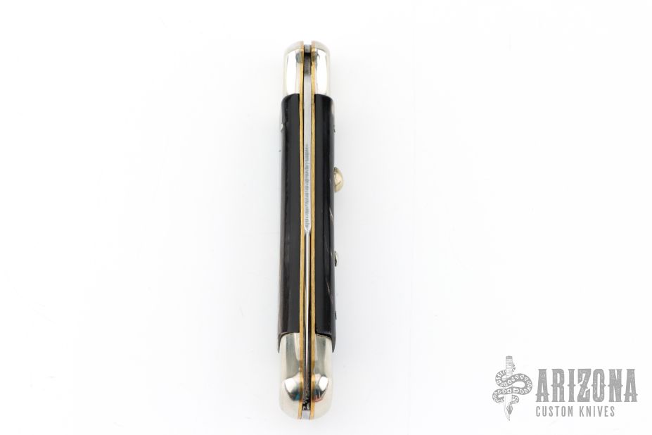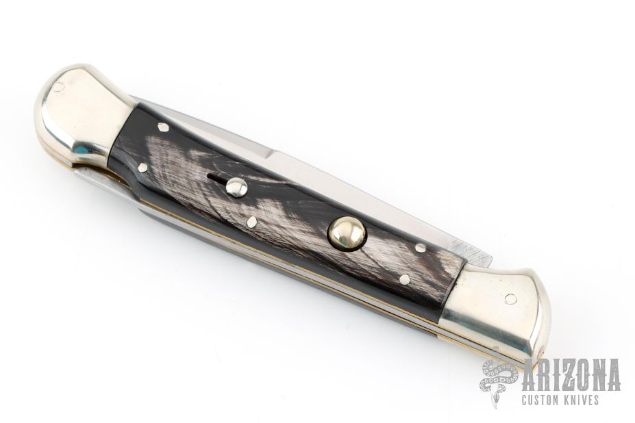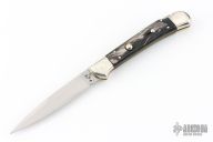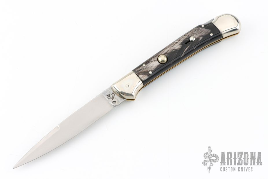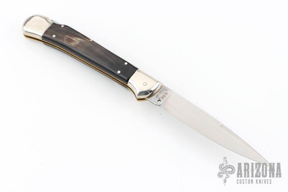 This Lockback Auto by Dolphin D.M. features a tumble polished spear point blade with false top edge. The Dolphin stamp is a partnership between Lucio DeBon and Francesco Mariani Lucio. The handle has nickel silver bolsters, buffalo horn scales, brass liners, stainless backspacer. Excellent condition.