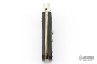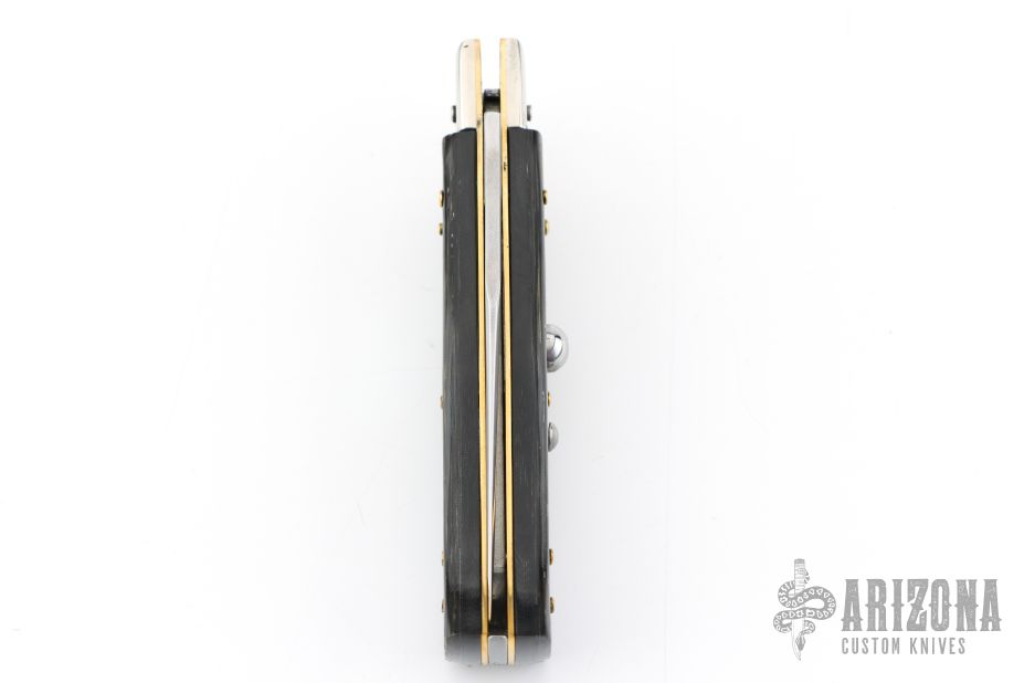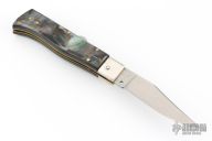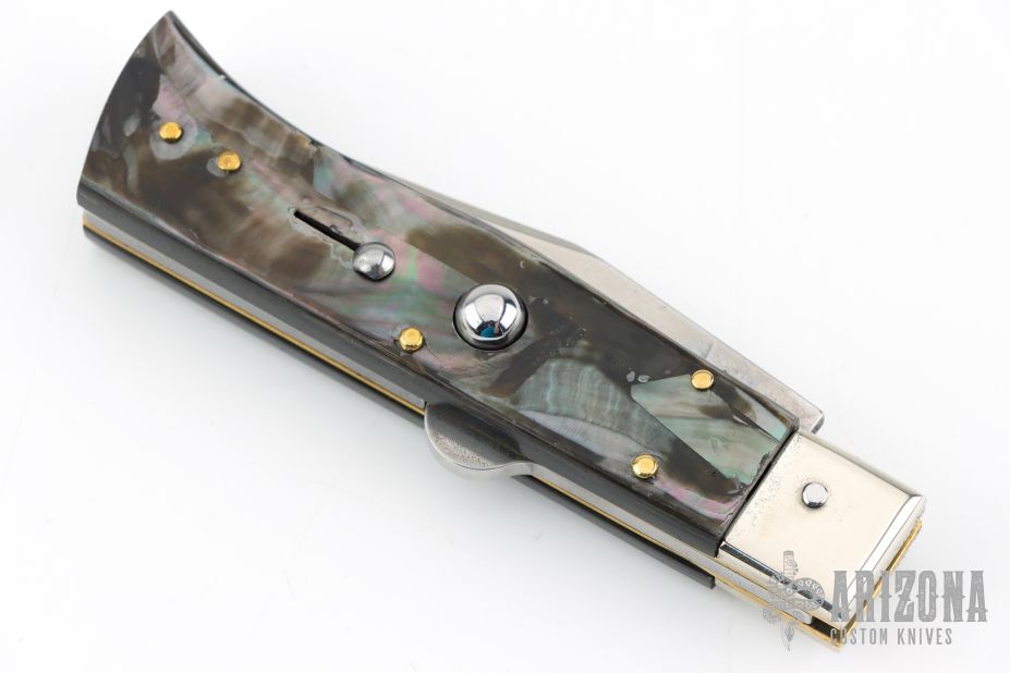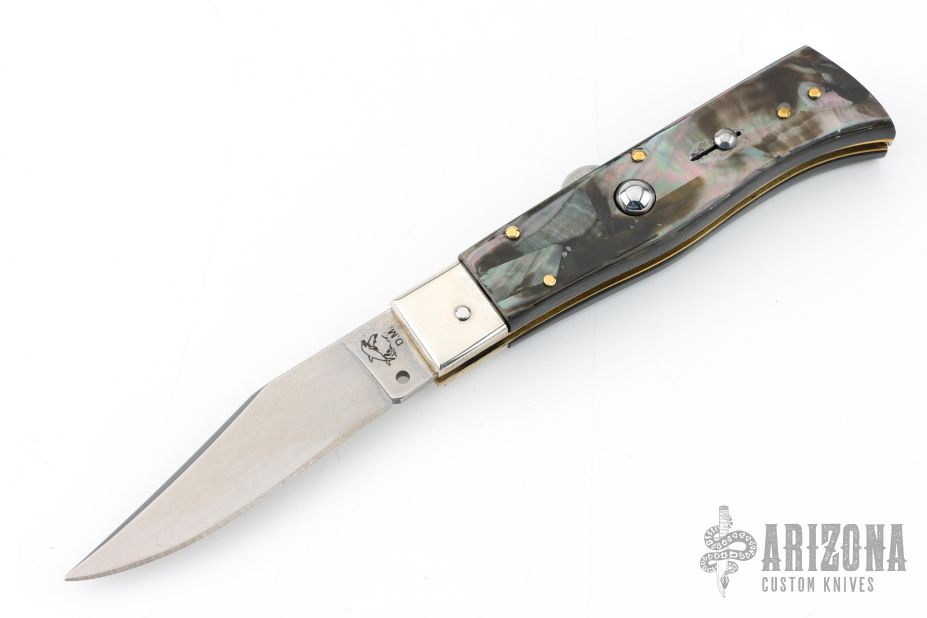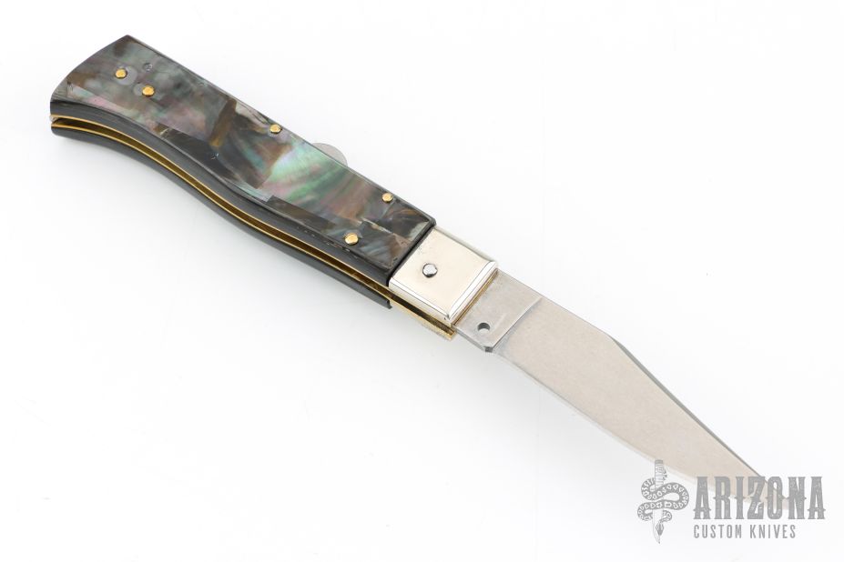 This Lockback Auto by Dolphin D.M. features a tumble polished clip point blade with false top edge. The handle has nickel silver bolsters, pearl scales, brass liners, stainless steel spring, and brass pins. Comes in maker's soft pouch. Excellent Condition.