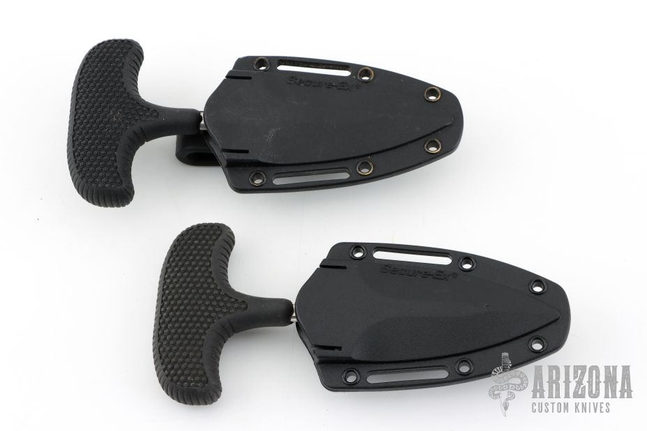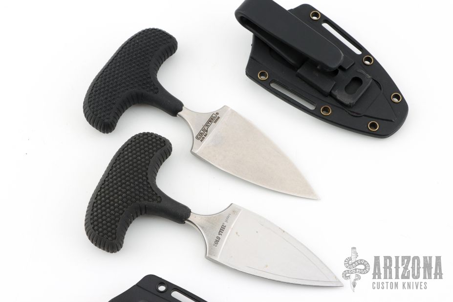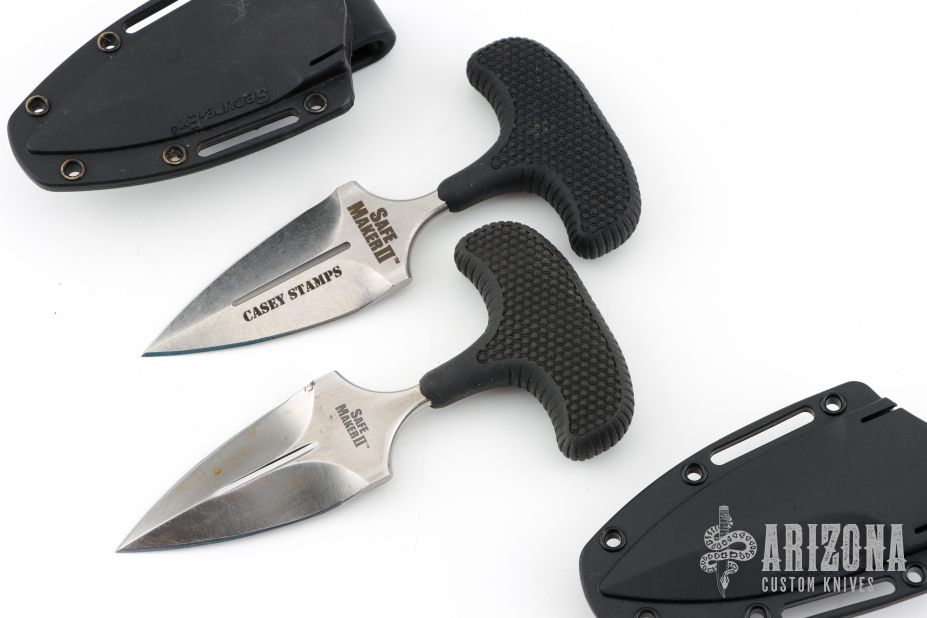 This is a pair of  Safe Maker II push daggers from Cold Steel. One has a satin finished blade and has been used and sharpened, and was made in Japan. Comes with original sheath. The other has a stonewashed blad with "Casey Stamps" on the blade and was made in Taiwan. Comes with original sheath. Excellent condition.