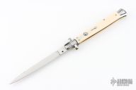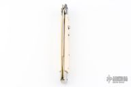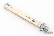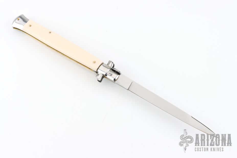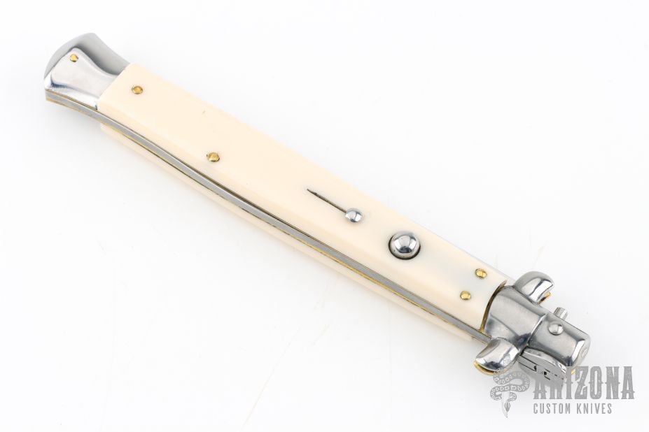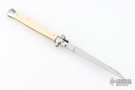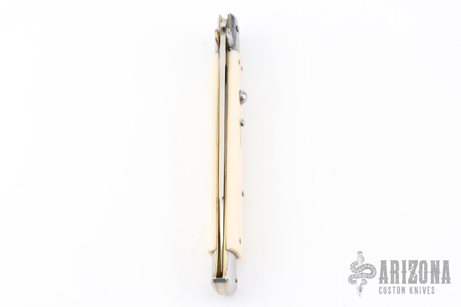 This 13" Swivel Bolster by Frank Beltrame features a flat ground blade with swedge. The handle has stainless steel bolsters, front and rear, imitation ivory scales, brass liners, stainless spring. Has some light scratches, otherwise Excellent condition.