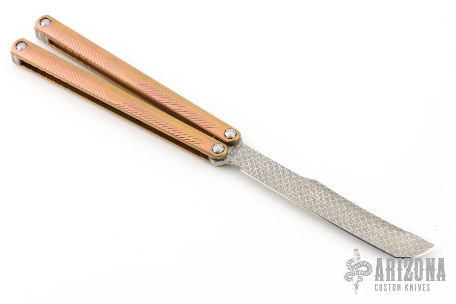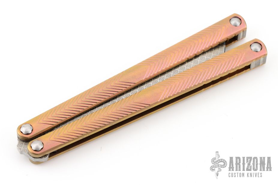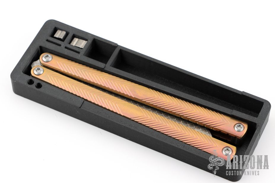 This one has a laser engraved blade with milled bevels. It has milled and anodized titanium two-piece titanium handles. Comes with original 3D printed box with extra bushings and modular weight system. Excellent condition. #13 of 25