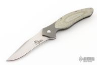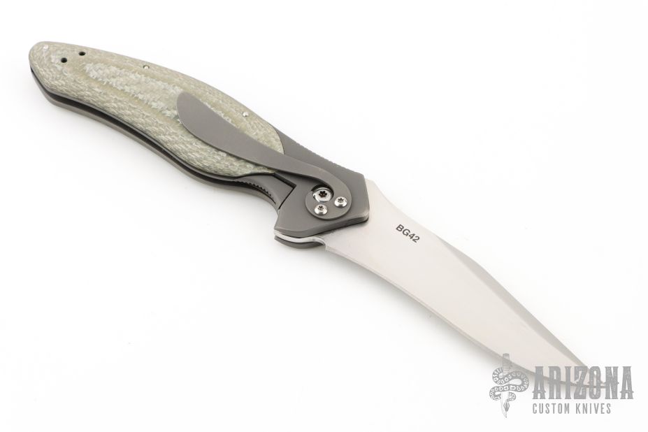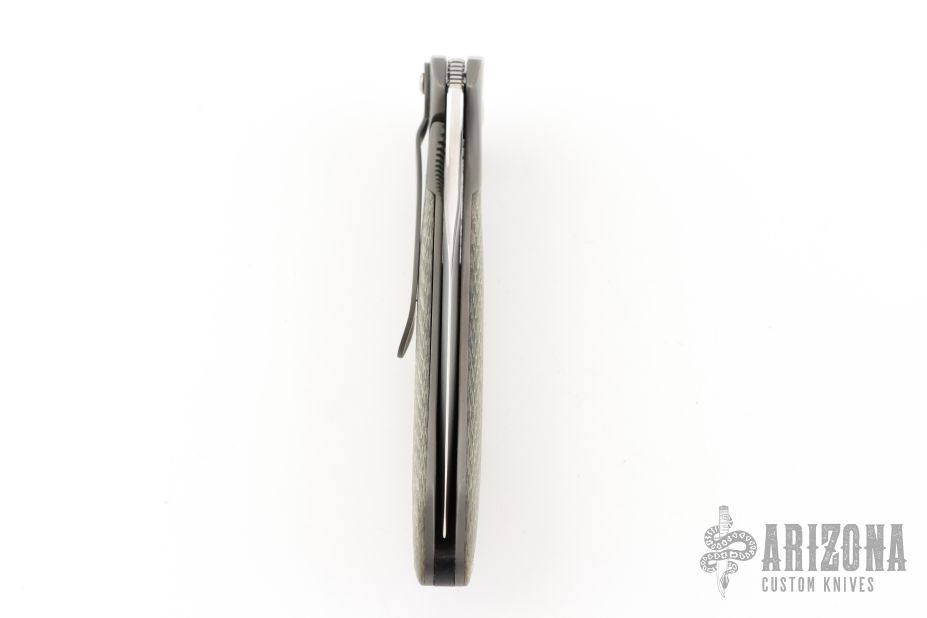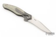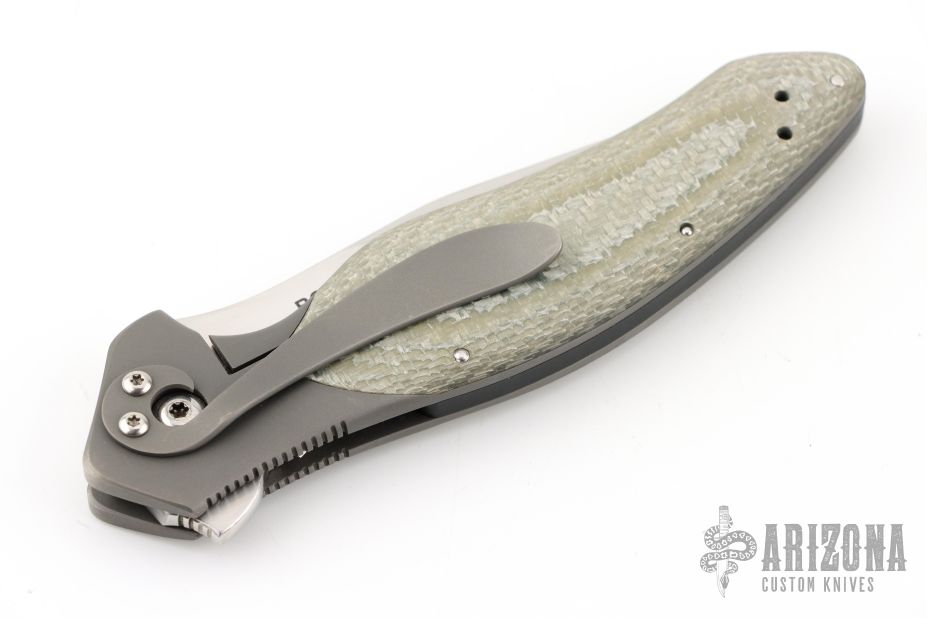 This Dead Seasy Flipper from Ken Onion features a hand rub satin finished recurve blade with notched thumbrest and flipper. The handle has a bead blasted titanium frame, silver twill scales, black G-10 backspacer, reversible titanium tip up/down clip. Fast, crisp opening with the Speed Safe Assisted Opening mechanism and solid lock up, nice blade seating. Has some light scuffs and scratches, otherwise excellent condition. Comes with a zippered case.