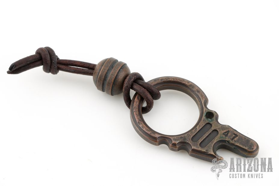 This Goblin by Serge Panchenko features a distressed copper finish. Numbered "47". Includes an attached matching bead. Excellent condition.