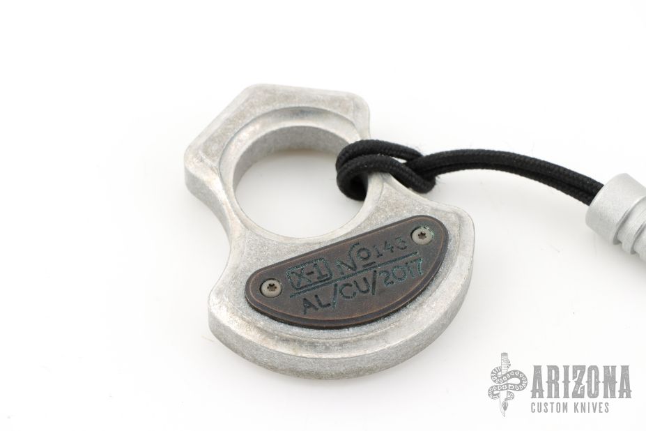 These X-1 Knucks from Serge Panchenko are crafted from aluminum and copper. Each piece is etched to create a distressed patina finish. Each piece is also serialized. Comes with an attached matching bead. Excellent condition. #143/2017