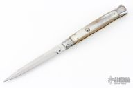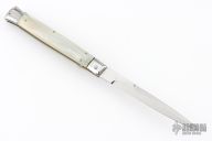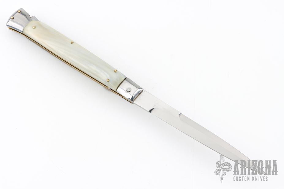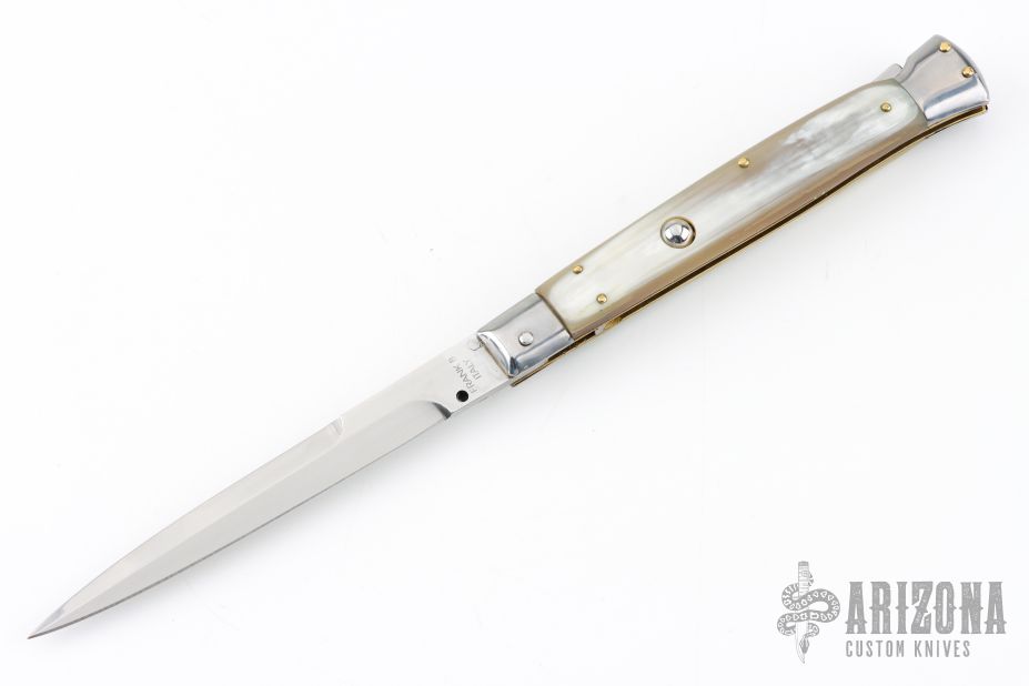 This 11" Lockback Auto by Frank Beltrame features a spear point blade with false top edge. The handle has stainless steel bolsters, front and rear, honey horn scales, brass liners, stainless backspacer. Excellent condition.  This knife was original a Swing Guard auto, but the swing guard has been removed.