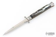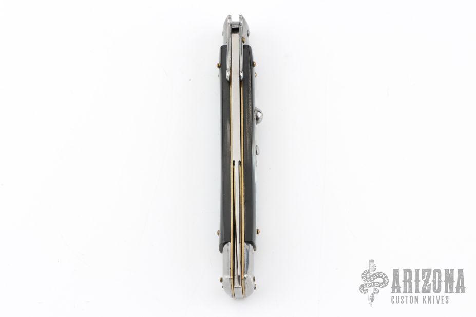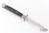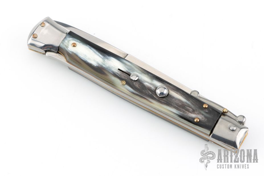 This Swing Guard Auto has a mirror polished bayonet ground blade with false top edge. The handle is composed of stainless steel front and rear bolsters, brass liners all complemented by buffalo horn scales. Excellent condition.