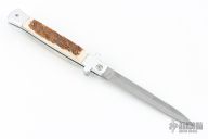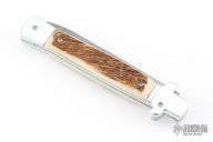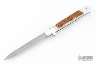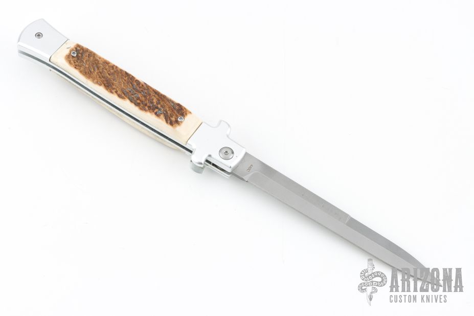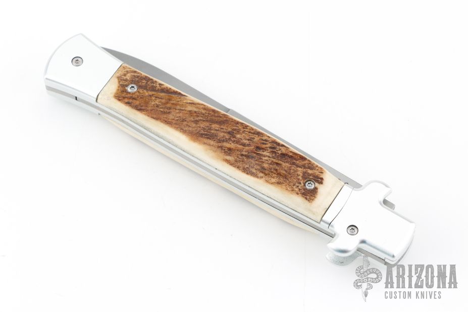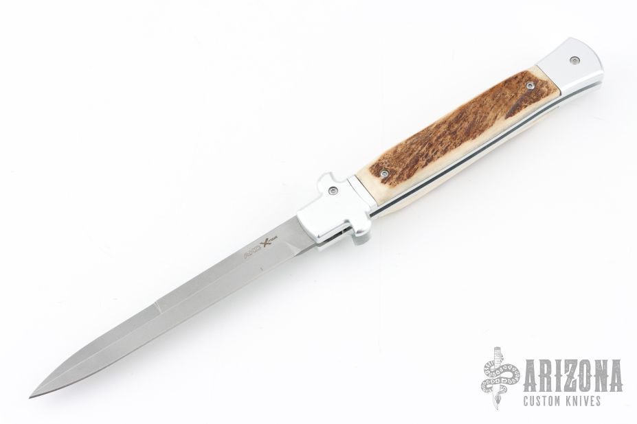 This X-Treme Shadow Bolster Release Auto by AKC Italy features a tumble finished blade and bead blast finished aluminum frame with stag inlays. Comes with original box. Excellent condition.