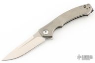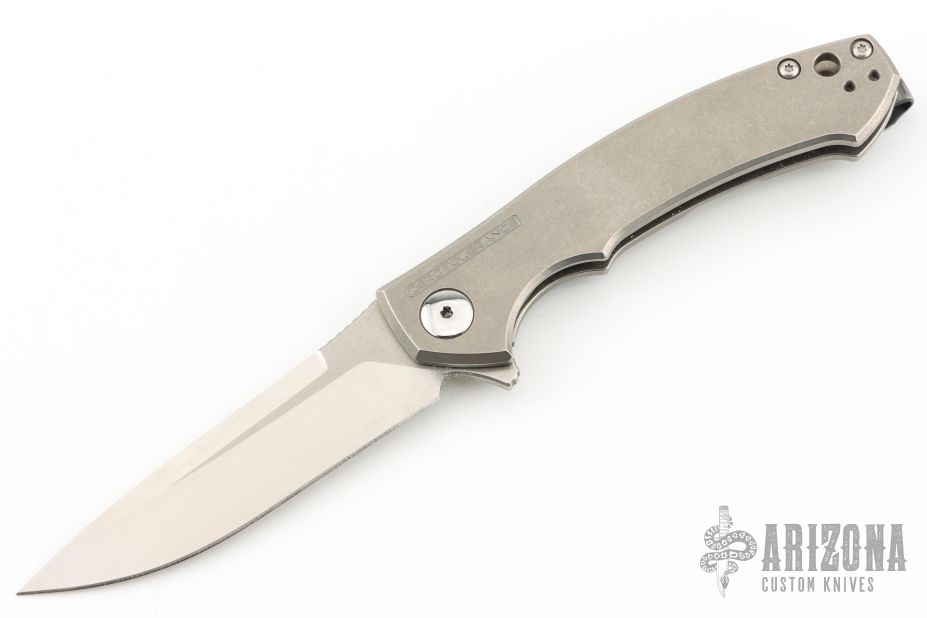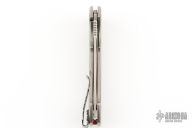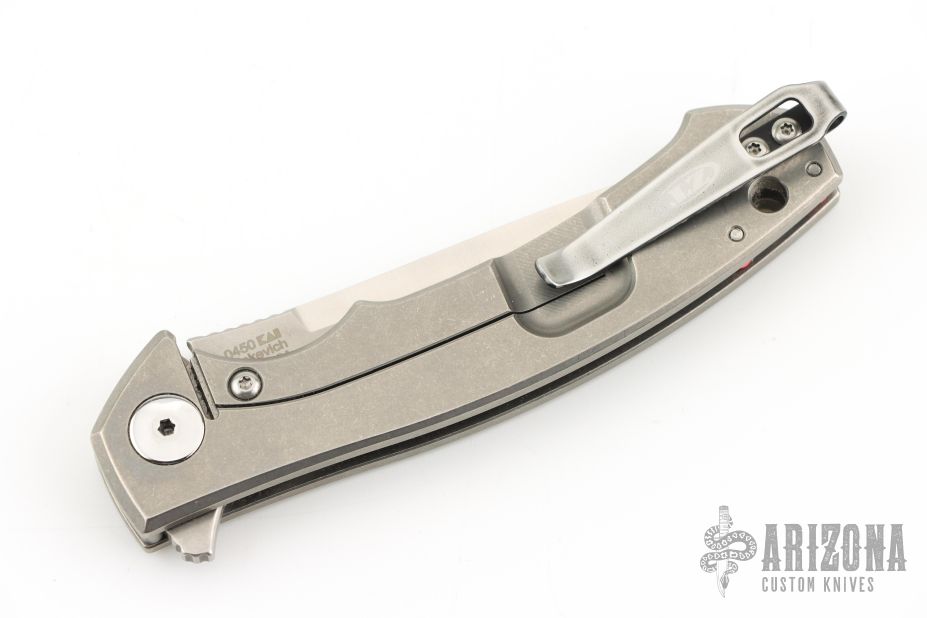 This 0450 Sinkevich designed folder from Zero Tolerance features a drop point blade with swedge and flipper. The handle is comprised of a tumbled titanium frame over red anodized aluminum stand offs, and a deep carry stainless steel pocket clip. Has wear on the clip finish, otherwise excellent condition.