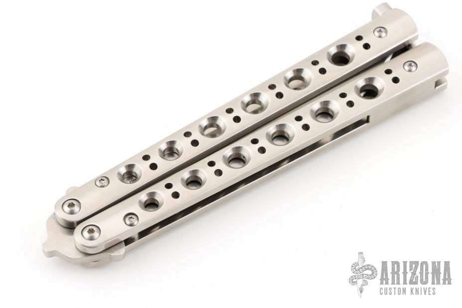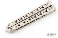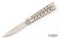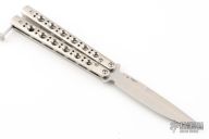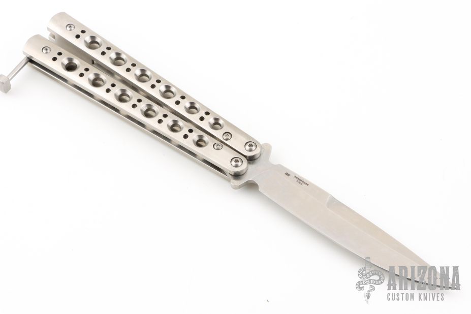 This Model 62 Balisong by Benchmade features a stonewashed spear point D2 blade with a false top edge. The handle has stainless steel handles and latch. Includes the original box, papers and nylon sheath. Excellent condition.