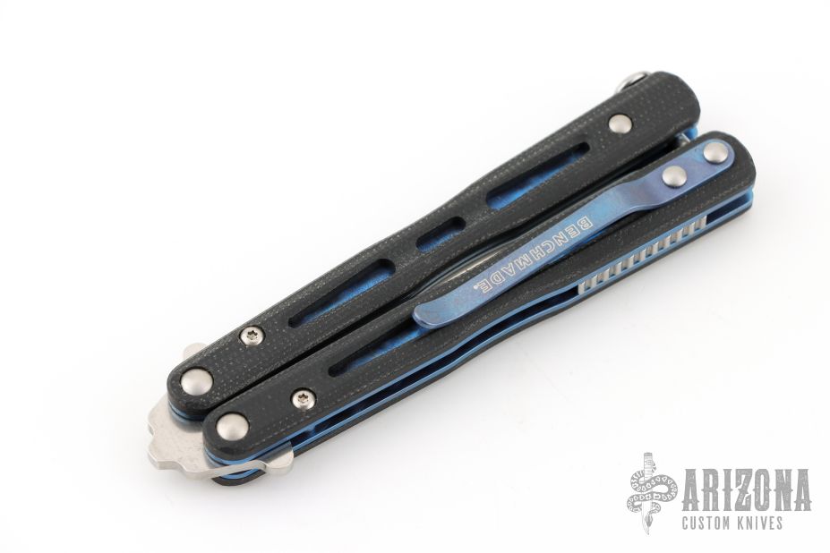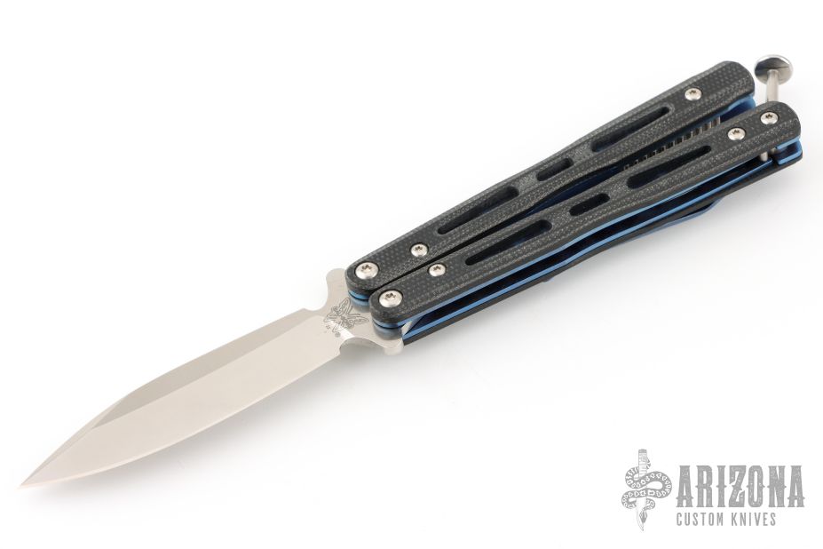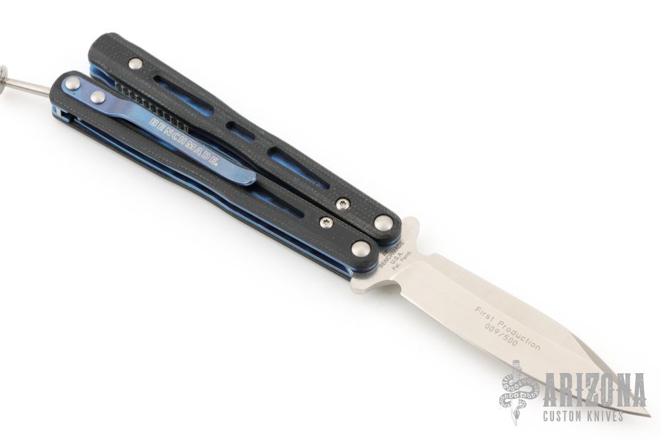 This Model 32 Morpho Balisong by Benchmade has a stone washed spearpoint blade with swedge. The handle is comprised of machined black G10 scales with anodized and jeweled titnaium liners and machined stainless steel spacers. Blue anodized titanium clip is positioned for tip up carry. Marked "First Production 009/500" on blade. Includes original box, and drawstring pouch. Excellent condition.