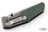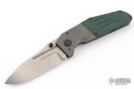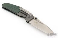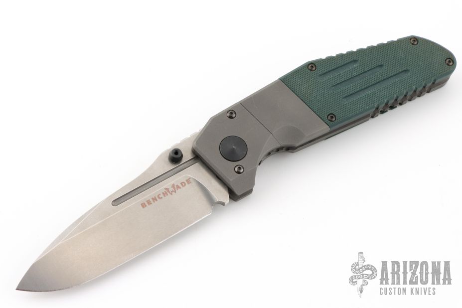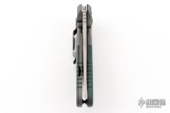 This MLK D/A by Benchmade is a Shane Sibert design, it features a tumble finished blade with dual thumbstuds, and a notched thumbrest. The handle has a bead blasted titanium frame with green G-10 scales, a black stainless steel liner, and black barrel spacers. #1247 on blade. Comes in a blue Benchmade box that has had the label removed. Has a couple light scuffs and scratches, great condition otherwise.