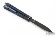 This Model 51 Morpho Balisong from Benchmade has a black finished D2 stainless steel spear point blade. Handle is black G10 with blue jeweled/ anodized titanium liners and blue anodized titanium tip up clip. Comes in a Benchmade drawstring pouch. Excellent condition.