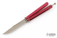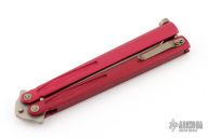This Tachyon III balisong by Microtech Knives has a bronze finished blade with false top edge. The handles are integral red aluminum with spring latch and tip up stainless steel clip, all bronzed hardware. Dated 05/2017 and s/n 01976. Has a couple light scratches, otherwise Excellent condition.