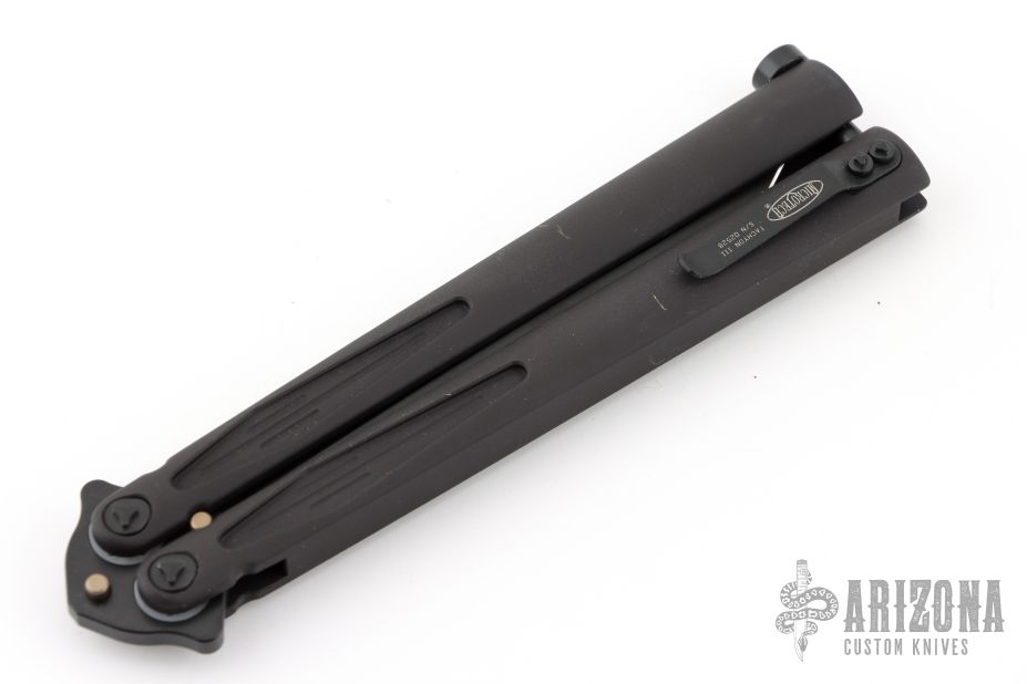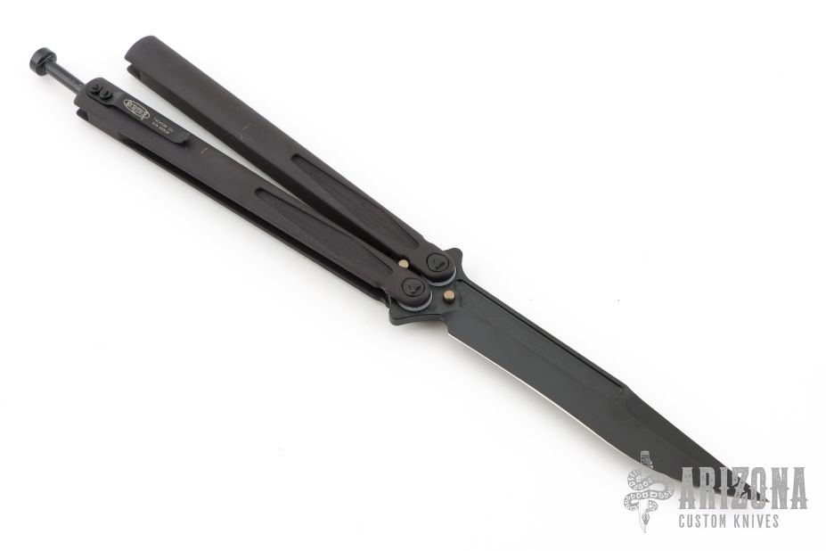 This Tachyon III balisong by Microtech Knives has a DLC finished blade with false top edge. The handles are integral black aluminum with spring latch and tip up stainless steel clip, all black hardware. Includes original box and papers. Dated 09/2017. Has scuffs and scratches, good condition otherwise.