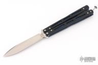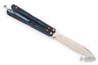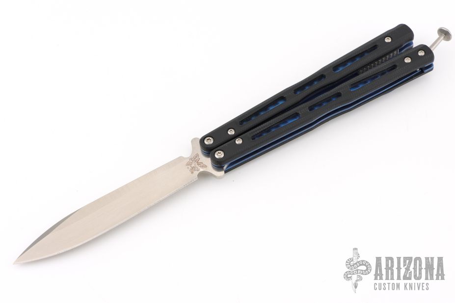 This Model 51 Morpho Balisong from Benchmade has a stonewash finished D2 stainless steel spear point blade. Handle is black G10 with blue jeweled/ anodized titanium liners and blue anodized titanium tip up clip. Comes with original box, papers, and drawstring pouch. Like new condition, the box was sealed prior to writing up the knife.