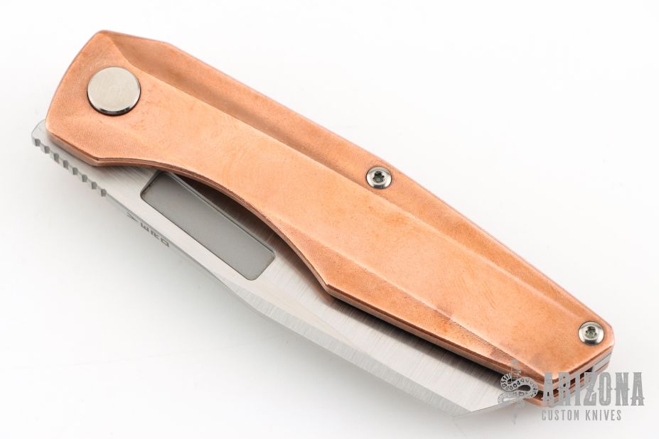 This Axon Mini Linerlock Folder by Vero Engineering features a satin finished blade with notched thumbrest and thumbhole. The handle has copper scales with inlaid liner, tip up titanium clip with hidden screws, titanium backspacer. Rides on bearings, nice detent, lockup and blade seating. Comes with a set of red G-10 scales, and a set of red/black crosscut carbon fiber scales. #062 on the blade. Has some light scratches on the copper, otherwise excellent condition.