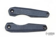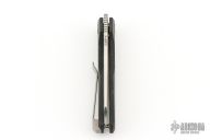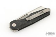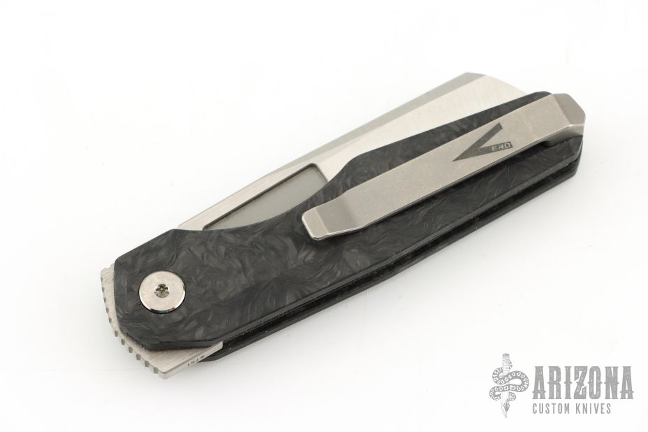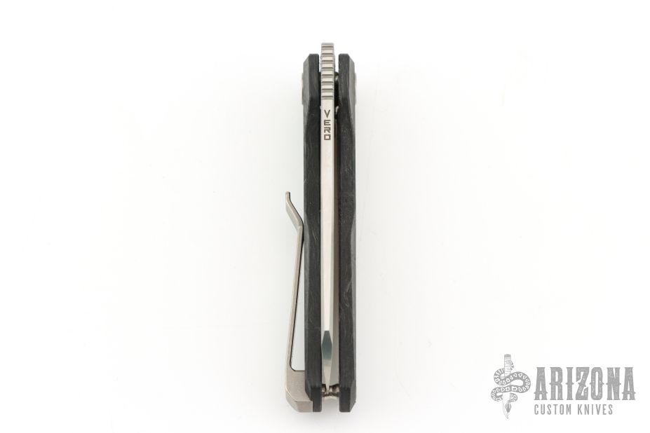 This Neuron by Vero Engineering features a satin finished blade with notched thumbrest and flipper. The handle has a marble carbon fiber frame, tip up titanium clip with hidden screws. Rides on bearings, nice double detent and blade seating. Comes with a set of denim micarta scales as well. #781. Has some scuffs, otherwise good condition.