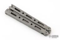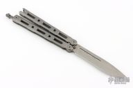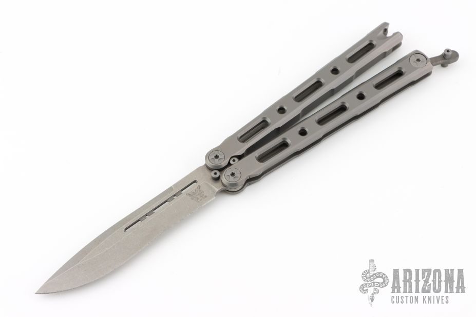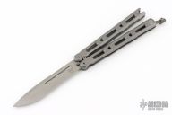 This Model 85 Balisong by Benchmade features a tumble finished blade. The handle has an integrally constructed, skeletonized titanium frame with bead blast finish. Spring-loaded T latch on pommel. Comes with original box, papers and slip sheath. Excellent condition.