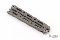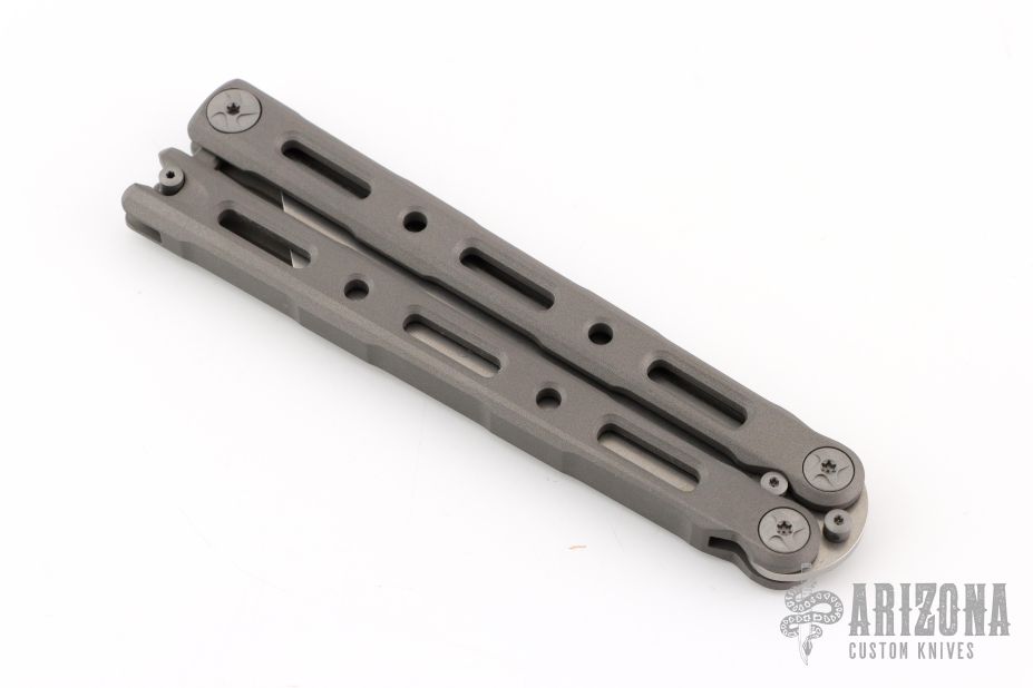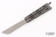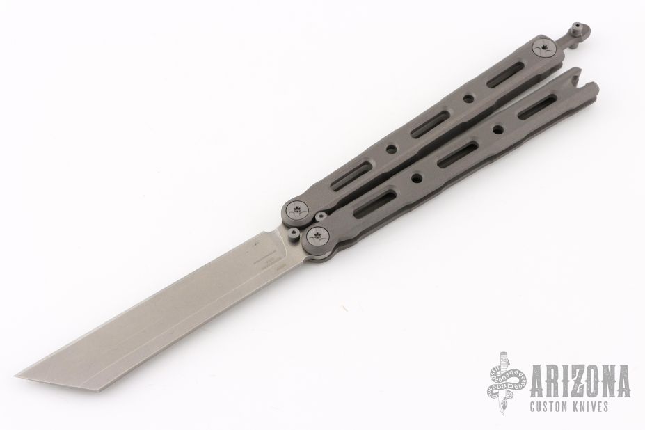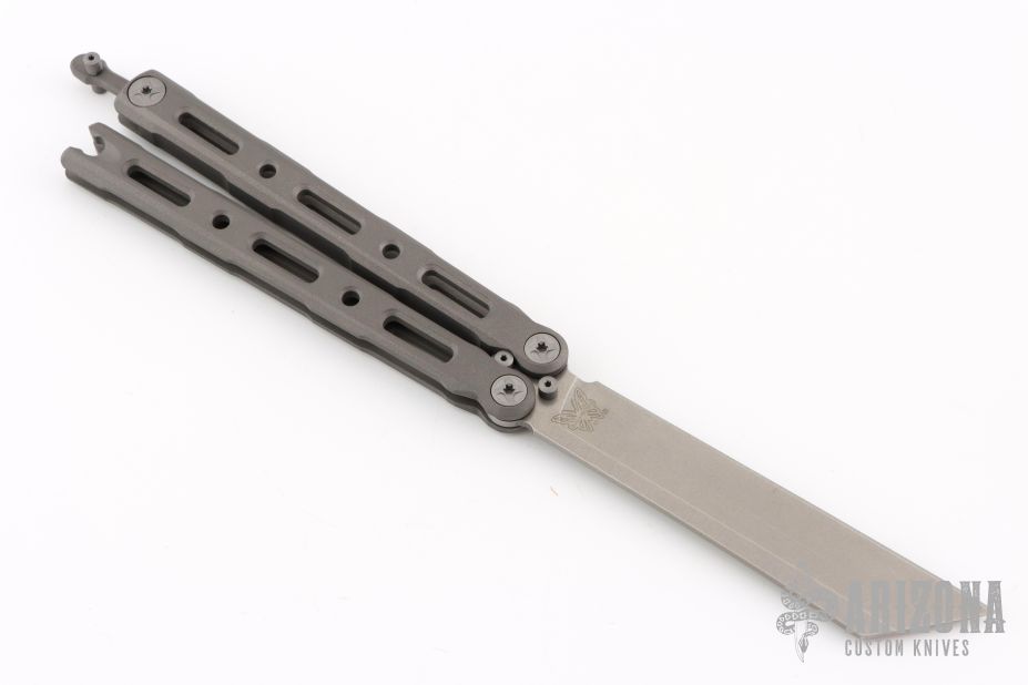 This Model 87 Balisong by Benchmade features a tumble finished wharncliffe style blade. The handle has an integrally constructed, skeletonized titanium frame with bead blast finish. Spring-loaded T latch on pommel. Comes with original box, sheath and papers. Excellent condition.