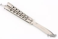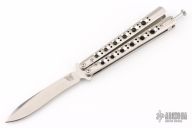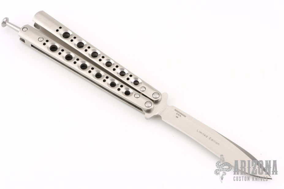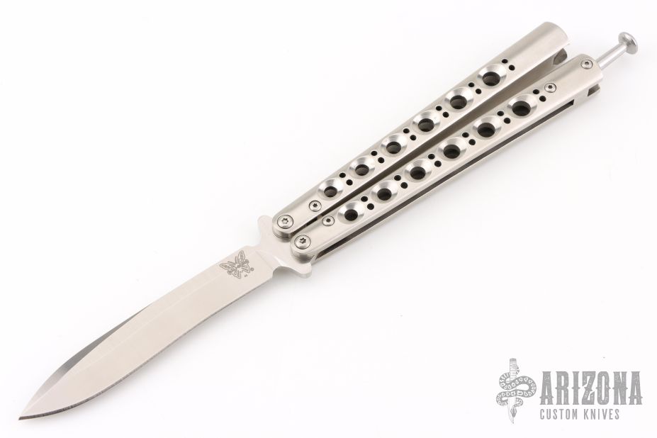 This Model 41SS Balisong from Benchmade features a recurve drop point blade with swedge. The handle has a stainless steel frame with spring T-latch. Comes with original box, papers, and two Benchmade belt sheaths. Excellent condition.