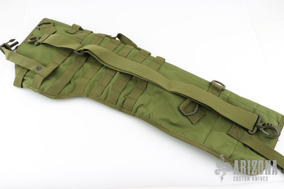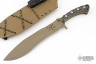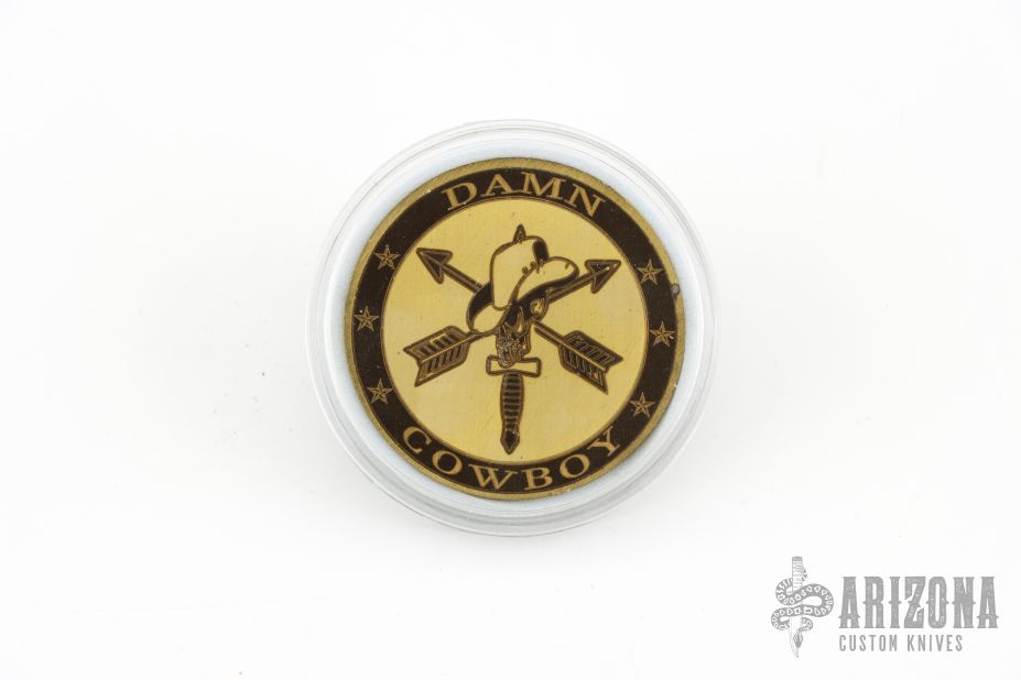 This Damn Cowboy by Kraken Tactical features a OD Green cerakote blade with notched thumbrest, .201" blade stock and 2.145" blade depth, full tang construction. The handle has laser engraved Nylon66 scales with brass liners. Comes with a kydex sheath and nylon carrying case. Comes with COA #26 of 100, and a challenge coin.