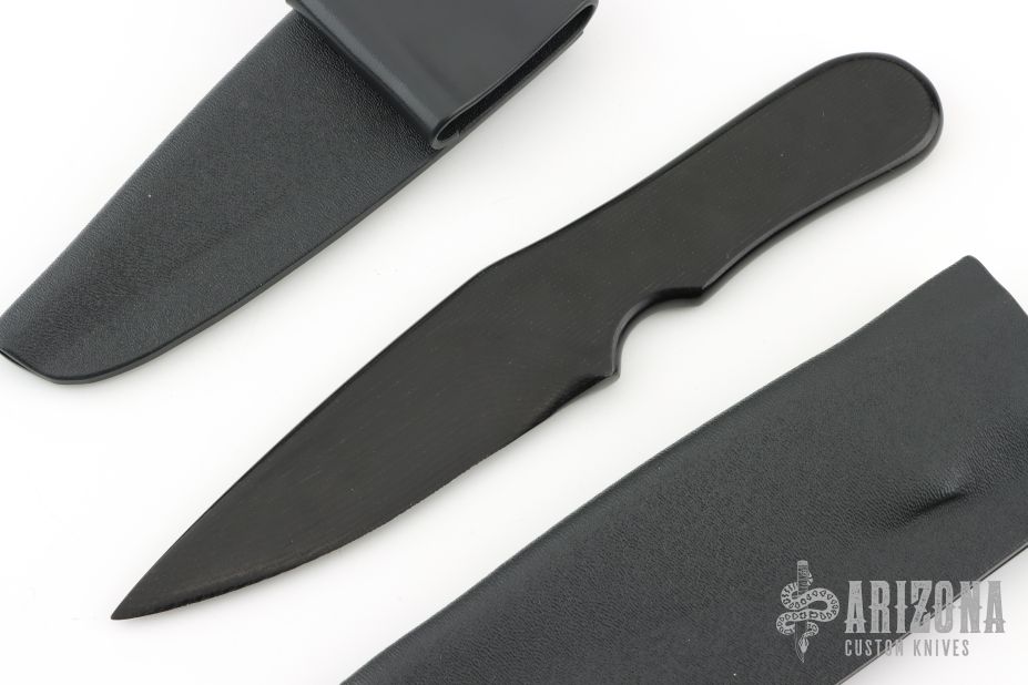 This is a Frequent Flyer from Mad Dog Knives. It features a clip point blade. Blade and handle are black G-10 and non-magnetic; .380" thickness. 1.588" blade depth. Fits well in the hand. Includes 2 kydex sheaths. Excellent Condition.