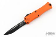 This knife features a two-tone clip point blade. The handle has an orange aluminum chassis with a black titanium pocket clip. Includes the original box and papers. Excellent Condition.