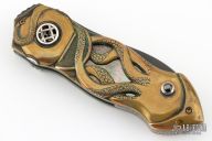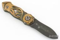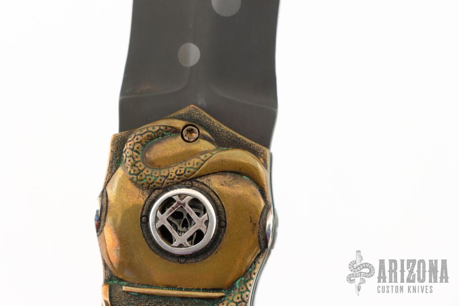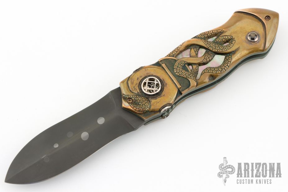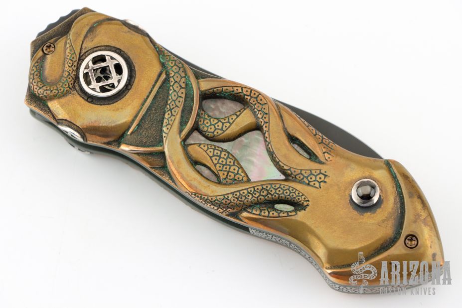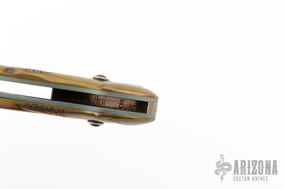 Breathtaking piece from Mike Burch and Jody Muller!  This is one of only a handful of collaborations and it's stunning. The blade is a recurve dagger with an acid etched finish and decorative "bubbles". The handle is carved and engraved bronze with black lip pearl, mother-of-pearl, and titanium accents, with bead blast finished liners, and carved titanium backstrap.