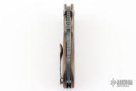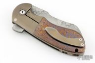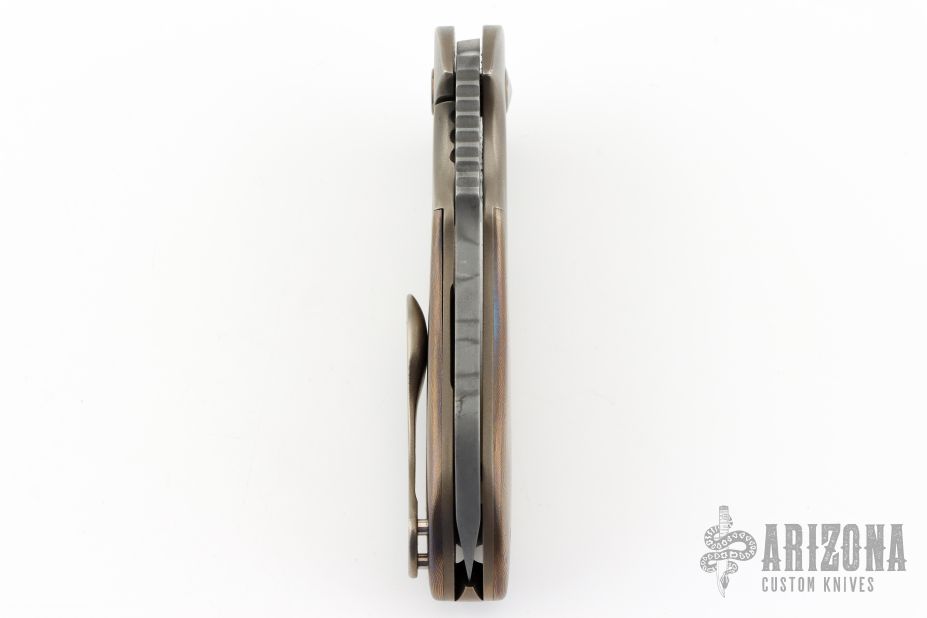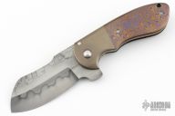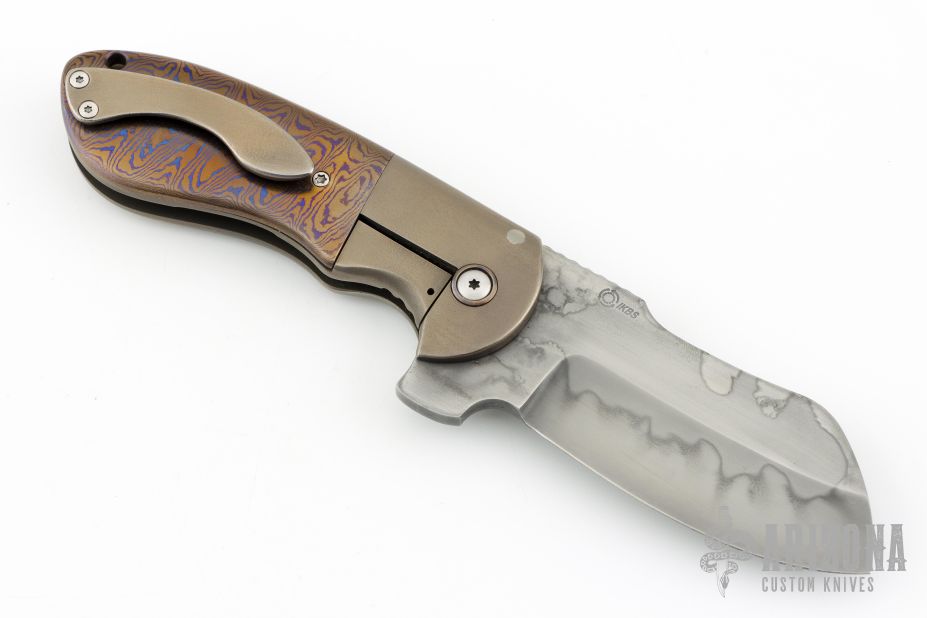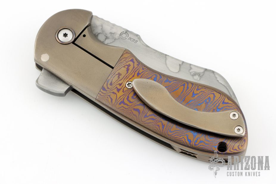 This Impetus flipper from Michael Burch features a hand rub satin finished blade with nice hamon, notched thumbrest and flipper. The handle has orange peel finished titanium bolsters, mokuti scales, mokuti pivot collars, orange peel finished and anodized titanium liners, tip up clip, and orange peel finished titanium backspacer. Nice detent, lockup and blade seating, rides on bearings. Excellent condition. Comes with a zippered case and COA dated TKI 2013.