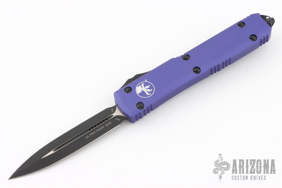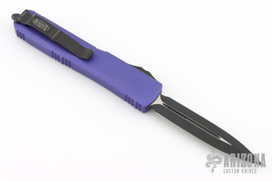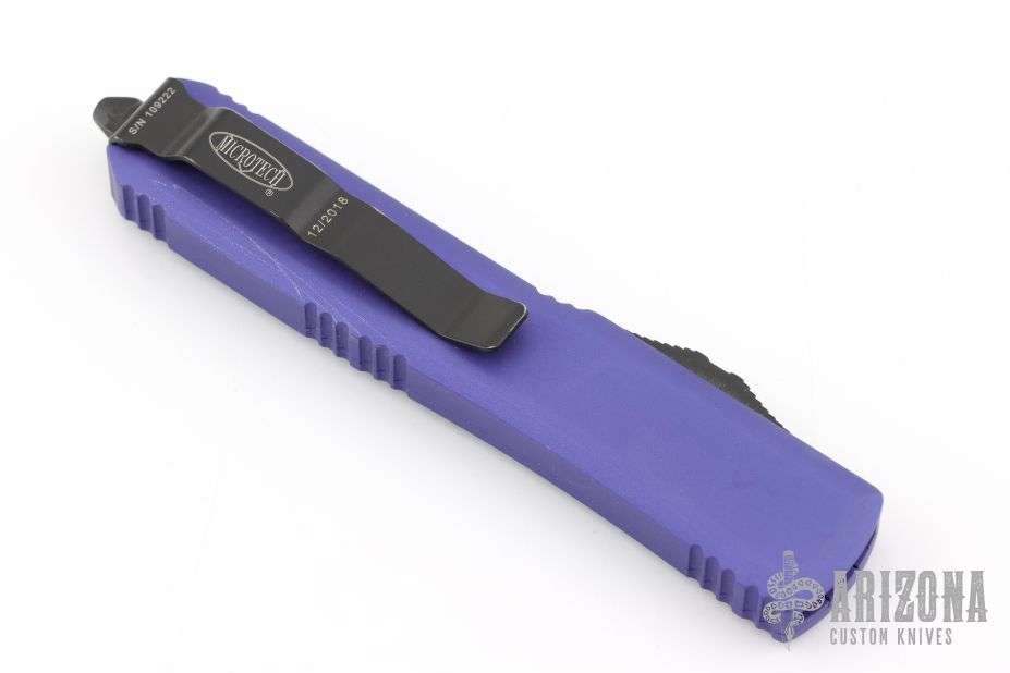 This Ultratech OTF automatic by Microtech features a D/E black standard blade. Purple aluminum frame. Tip down stainless steel clip. Serial number 109222 and dated 12/2018. Has some scratches on the frame and clip. Great condition otherwise.