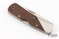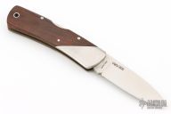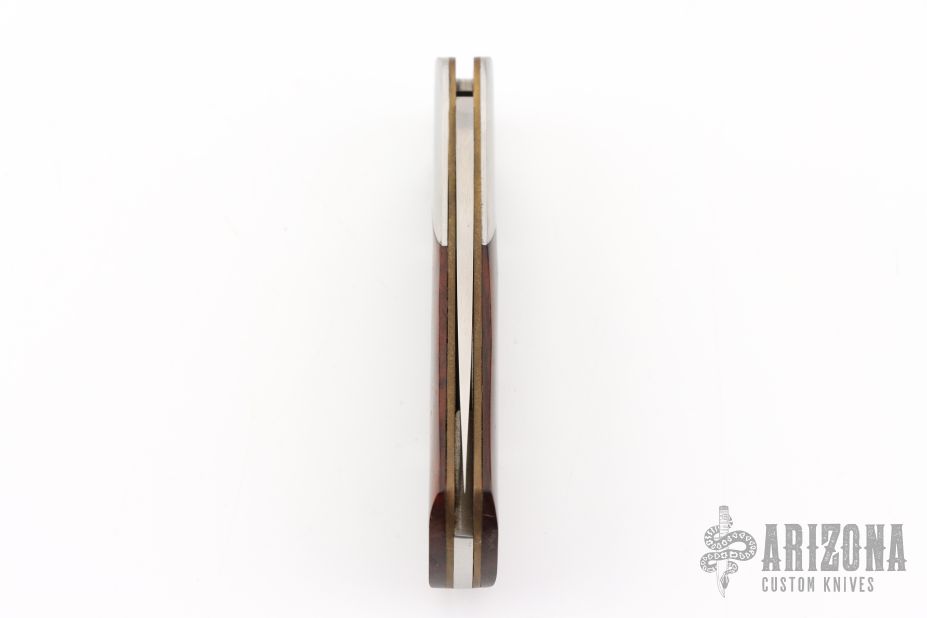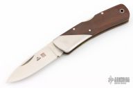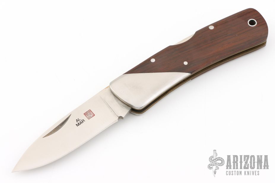 This is a lockback by Al Mar Knives with wood scales and satin stainless steel bolsters, brass liners, stainless steel backspacer. Has a satin drop point blade with nail nick. Has a couple light scratches, excellent condition otherwise.
