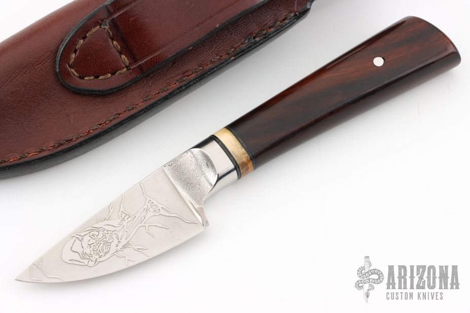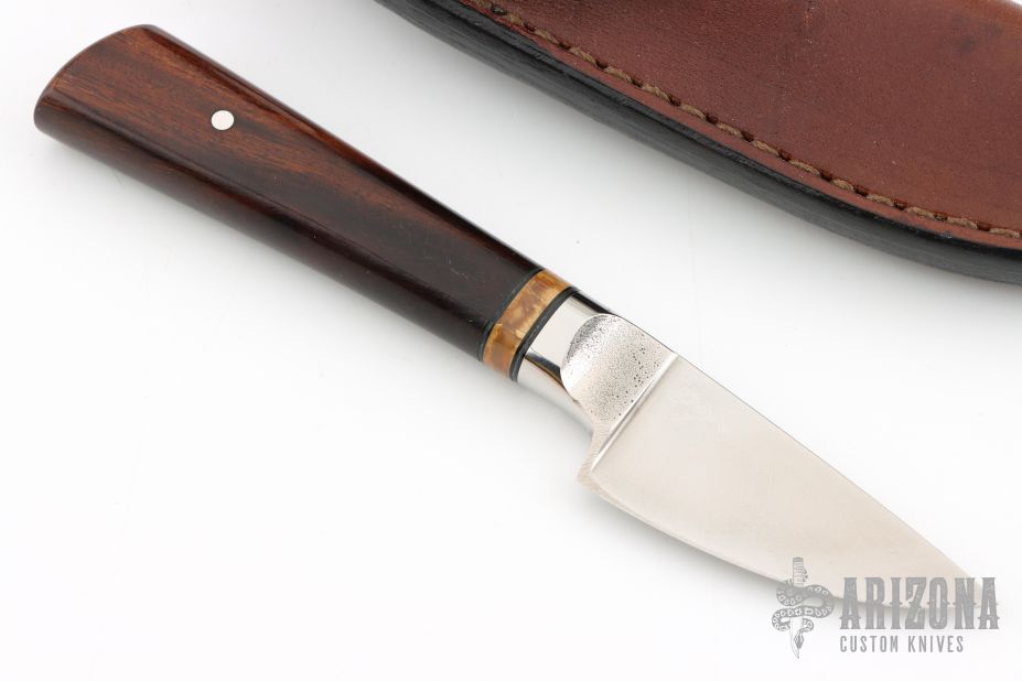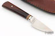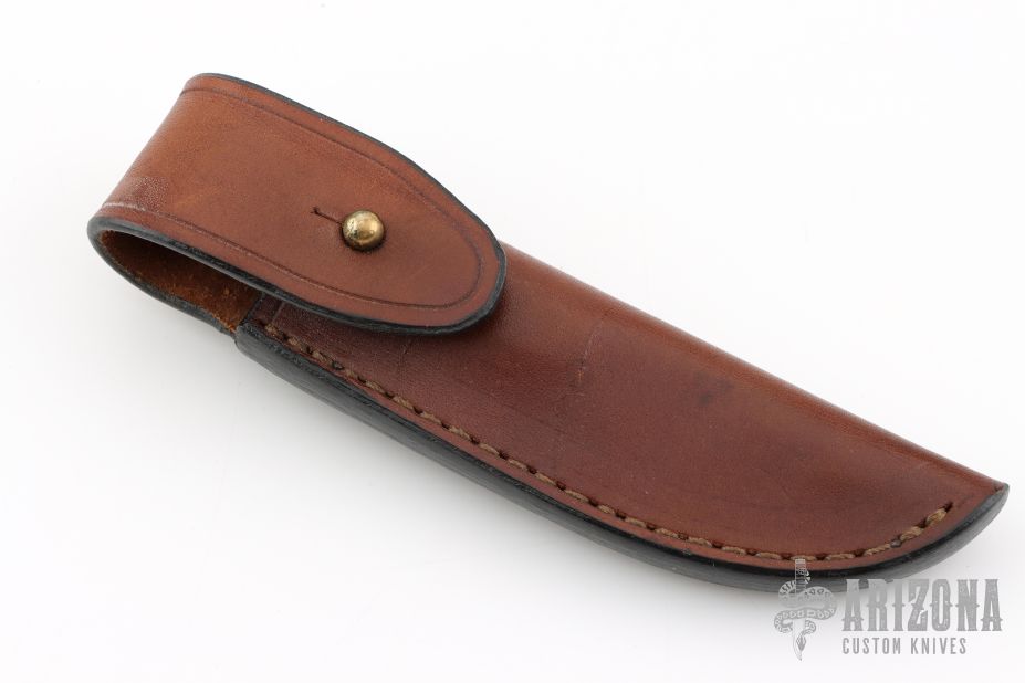 This knife by Boye features a drop point Dendritic steel blade, integral guard, .232" blade stock and .961" blade depth at the ricasso, hidden tang construction. The handle has a wood grip and bone/black spacer. Comes with a brown leather sheath. Has some scuffs on the blade. Excellent condition.