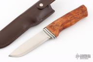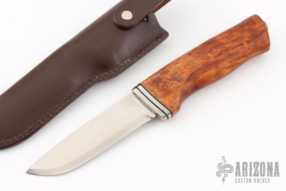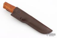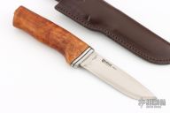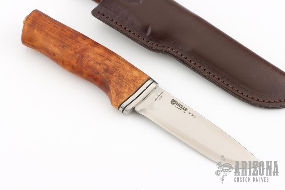 This Alden by Helle of Norway features a scandi ground drop point steel blade with .108" blade stock and 1.105" blade depth. The handle is comprised of an aluminum guard with black fiber and aluminum spacers and curly birch handle over hidden tang construction. Includes leather sheath with belt loop. Has a couple light scratches, otherwise Excellent condition.