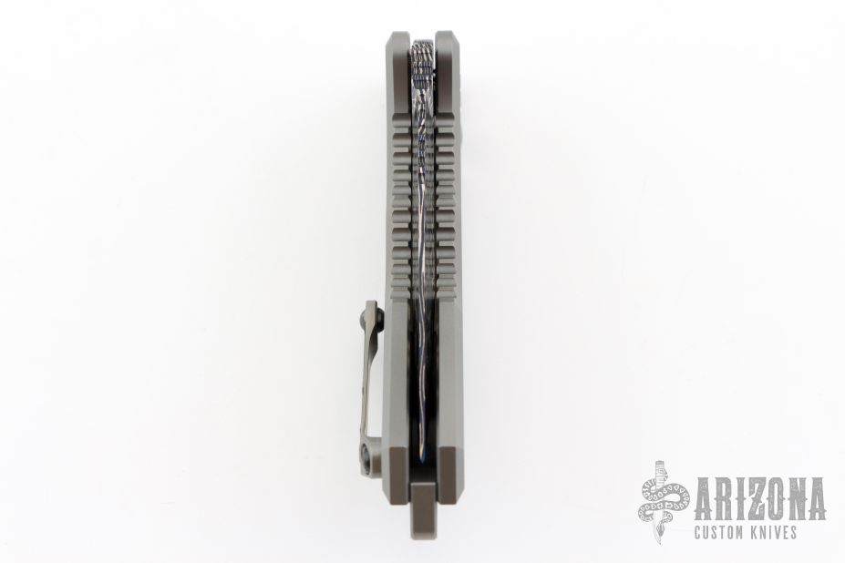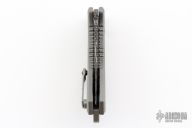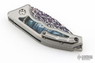 This Medusa by Heretic Knives features a Blued Vegas Forge Damascus multi-ground blade with false top edge, notched thumbrest. The handle has a two-tone titanium frame with cross cut mammoth ivory inlays, titanium backspacer and a tip up clip with ceramic ball. Comes with original box, COA, zippered case and drawstring bag.  S/N 020 and dated 08/23. Excellent condition.